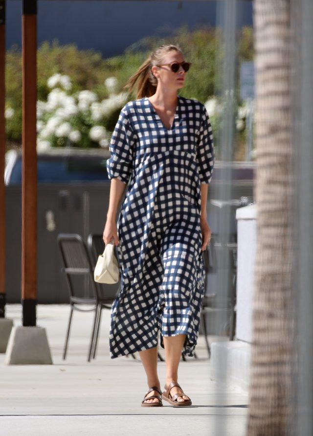 Мария вышла на прогулку в свободном платье, благодаря которому ей удалось спрятать растущий живот. А летний образ теннисистка дополнила босоножками и белой маленькой сумкой.