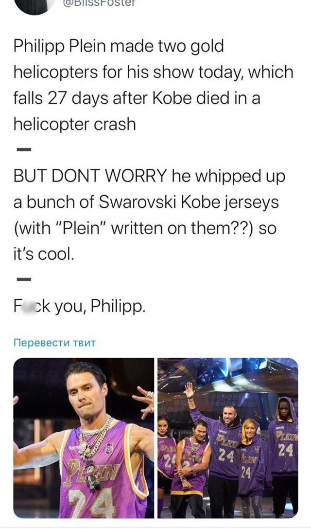 Правда, в Сети раскритиковали Плейна. Пользователи возмущены, что вещи украшены стразами, а логотип «Лейкерс» (за эту команду играл Коби) и надпись на груди заменены названием бренда. Кроме того, декорациями показа стали золотые вертолеты: «Филипп Плейн выставил два золотых вертолета на своем шоу, которое прошло через 27 дней после гибели Коби в результате крушения вертолета. Но не волнуйтесь, он выпустил майки Коби с камнями Swarovski, так что это классно. Иди к черту, Филипп», — отреагировали на показ в Twitter.