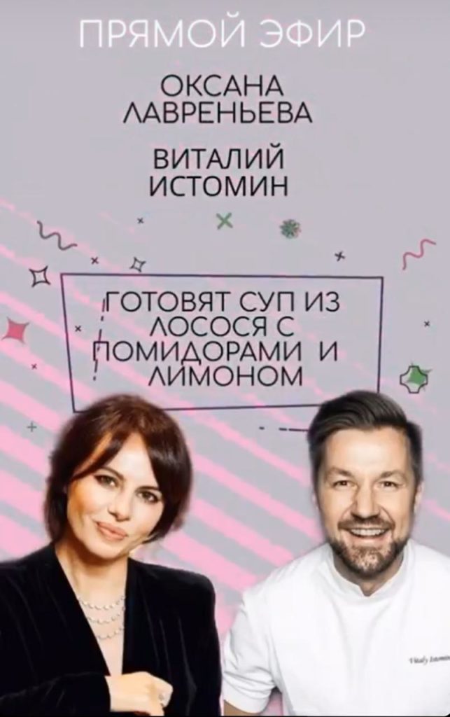 В 19:00 в прямом эфире в Instagram Оксана Лаврентьева и шеф-повар ресторанов «Сахалин» и «Техникум» Виталий Истомин приготовят суп из лосося с помидорами и лимоном.