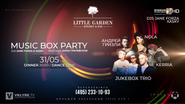 31 мая в ресторане Little Garden Kitchen & Bar пройдет вечеринка музыкального телеканала Music Box. На сцене будут зажигать Juke Box Trio, Nola и Андрей Гризли. Танцы, песни и вкусная еда гарантированы.