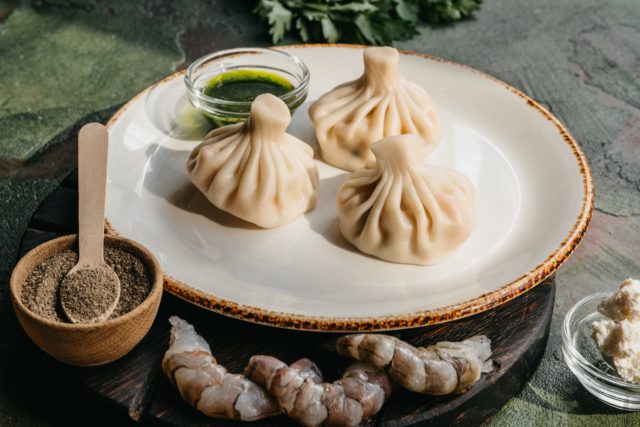 Хинкали с креветками и рикоттой (3 шт/550 р.) из обновленного меню должен попробовать каждый хотя бы раз (но вряд ли кто-то ограничится). Их отлично дополнит коктейль на основе клубники просекко Rossini (550 руб.).