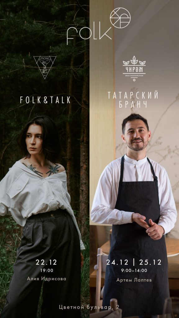 Финальный аккорд ярких этнических гестов — Folk провожает год сразу двумя татарскими гастролями. 22 декабря барный цикл Folk&Talk продолжит Алия Идрисова из казанского бара More. А 24 и 25 декабря команда ресторана «Чирэм» во главе с шефом Артемом Лаптевым приготовит бранч, наполнив зал ароматами татарской выпечки и аргамака.
