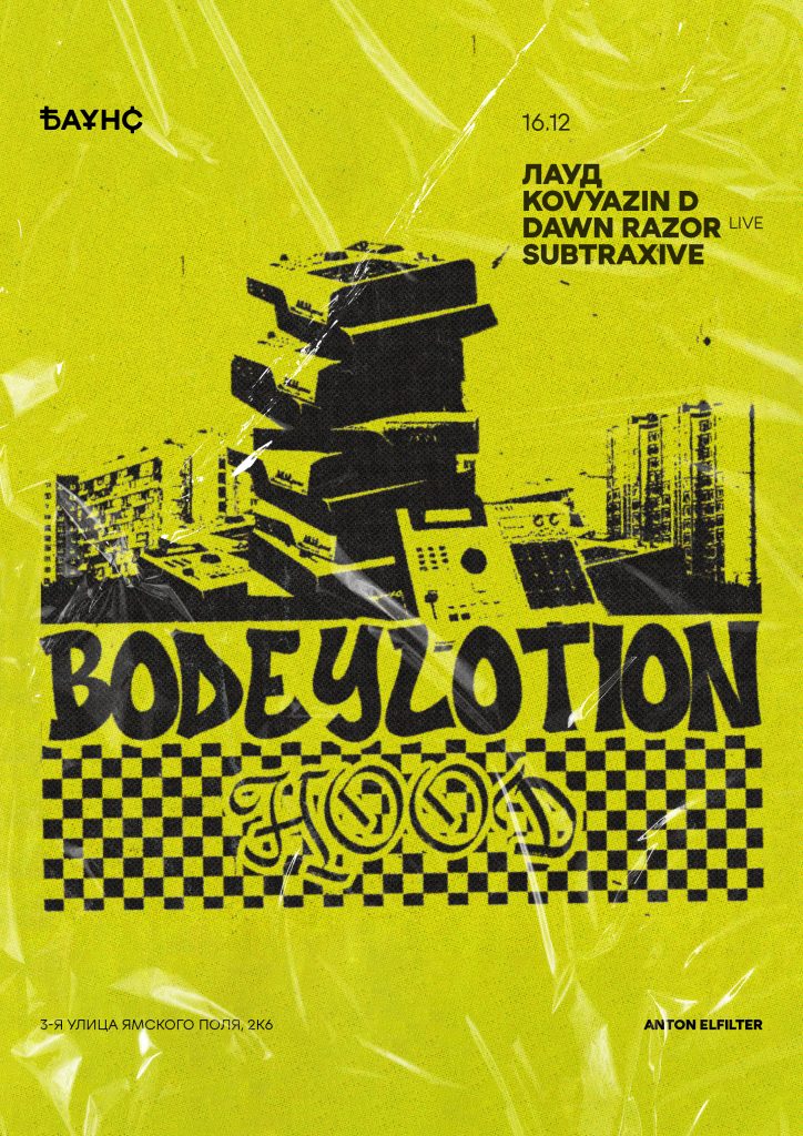 16 декабря в клубе Bounce пройдет вечеринка Bodeylotion hood. В лайнапе — электронное трио «Лауд», а также диджеи Kovyazin D, Dawn Razor и Subtraxive.