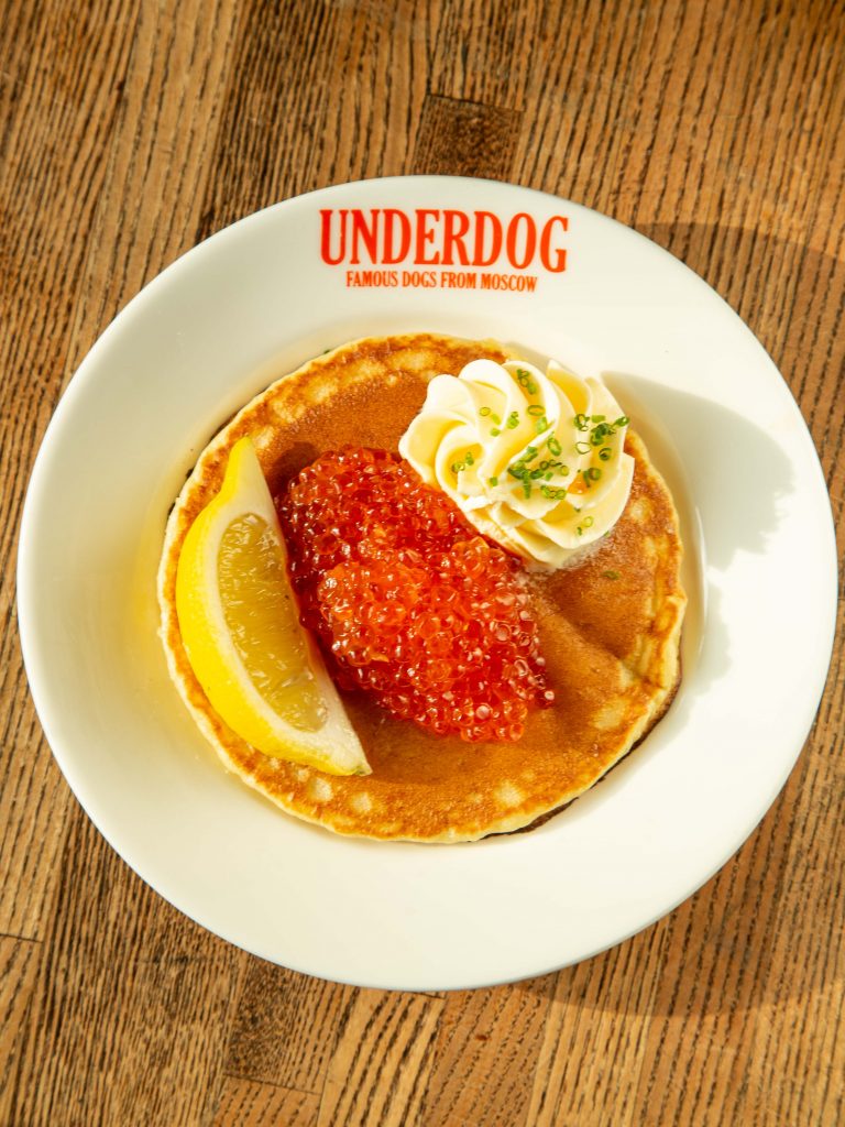 Спешл в Underdog, конечно, посвящен Масленице. В меню блюда, вдохновленные эстетикой Slavic Core: пухлый оладушек с внушительным куском взбитого масла, горкой красной икры и лимоном, а также наваристый борщ с томленой говядиной. На завтрак тоже можно заказать блины, например, с авокадо, беконом, яйцом и соусом голландез.