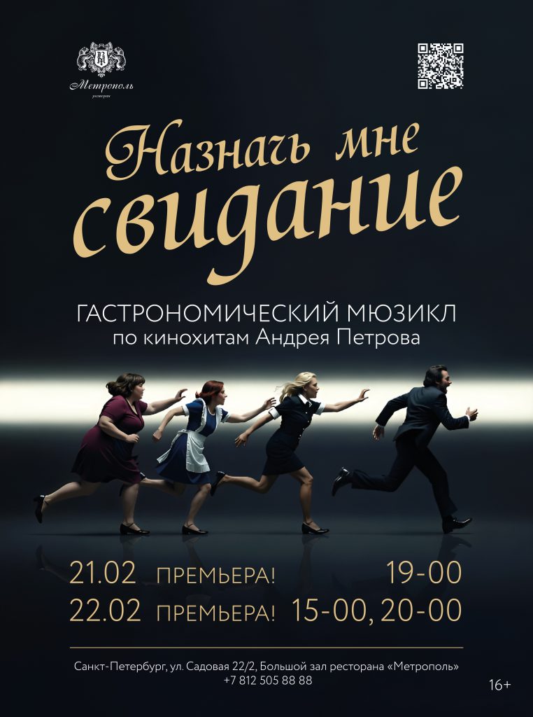 Если планировал провести выходные в Санкт-Петербурге или уже находишься в Северной столице, но не знаешь, куда сходить в выходные 21-22 февраля, мы нашли ответ на этот вопрос. В ресторане «Метрополь» пройдет премьера гастрономического мюзикла «Назначь мне свидание» по кинохитам композитора Андрея Петрова. На сцене выступят звезды российских мюзиклов и кино. Действие развернется сразу в нескольких эпохах, к каждой из которых подобраны известные мелодии, а бренд-шеф «Метрополя» разработал тематическое меню.