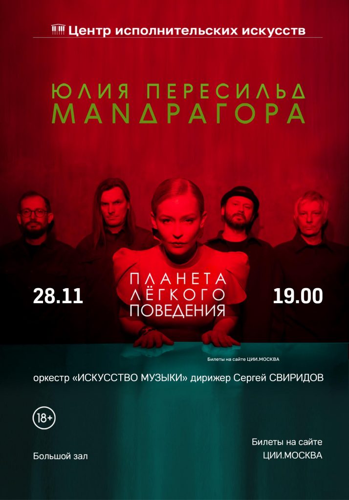 28 ноября Юлия Пересильд и группа МАNДРАГОРА выступит на сцене Центра исполнительских искусств с масштабной программой «Планета легкого поведения» – трилогией о любви, рассказанной с помощью музыки и сценических техник. Тебя ждет театрально-музыкальная постановка в двух актах. Чтобы получить эстетическое удовольствие и отдохнуть, бронируй билеты уже сейчас.