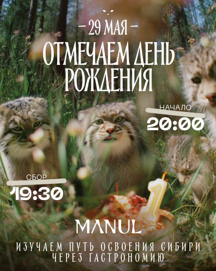 После тяжелого трудового дня можно устроить себе небольшой праздник и отправиться на ужин «Освоение Сибири» в Manul. Именно здесь 29 мая пройдет празднование дня рождения ресторана, которому исполняется год. Тебя ждут авторские блюда лучших шефов Сибири: Александра Кучерова, Романа Чемеренко, Александра Мордашева и Владимира Чистякова. А также музыкальный перфоманс от Forest Jam, Plutaya и Still Asian.