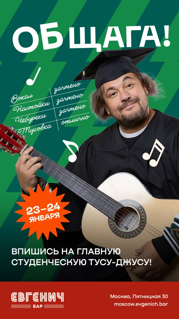 23-24 января в баре «Евгенич» пройдет вечеринка «Общага!», приуроченная ко Дню студента. Тебя ждут диджей-сеты, выступление кавер-группы с хитами прошлого и караоке до самого утра. Подготовлены специальные шоты, вдохновленные праздником и студенческими будними.