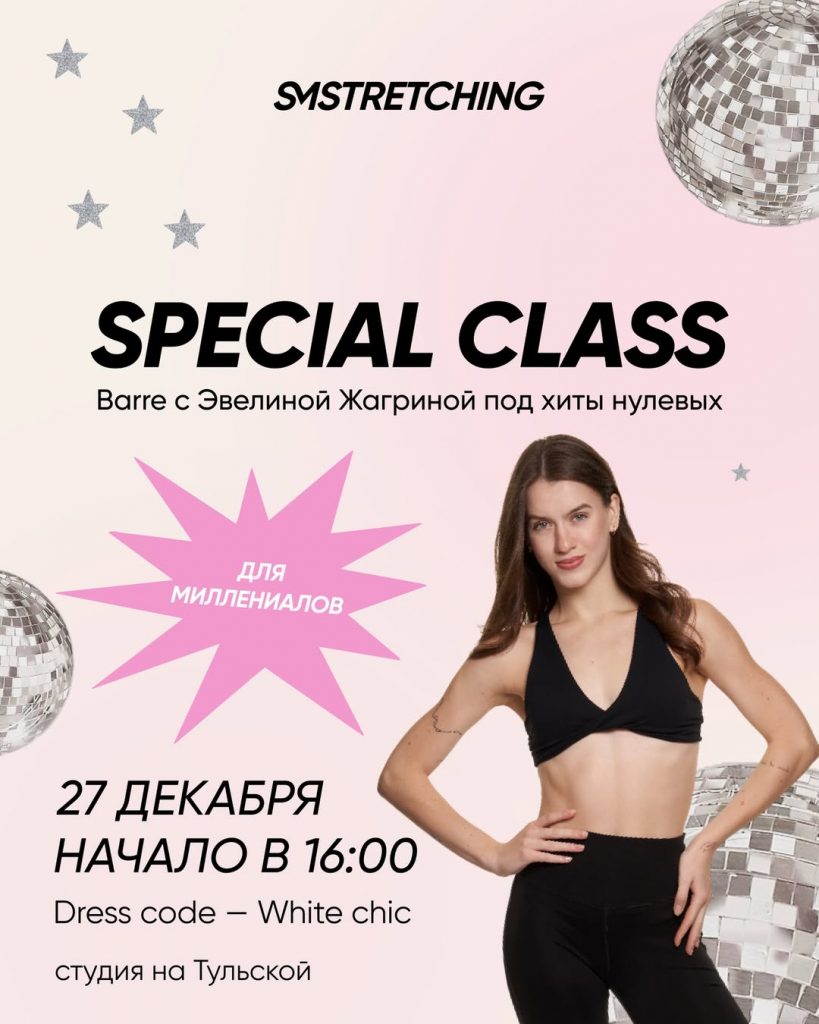 27 декабря в SMSTRETCHING на Тульской пройдут музыкальные special-классы по растяжке для миллениалов под хиты нулевых. Руководить процессом будет Эвелина Жагрина – специалист по barre-подкачке.