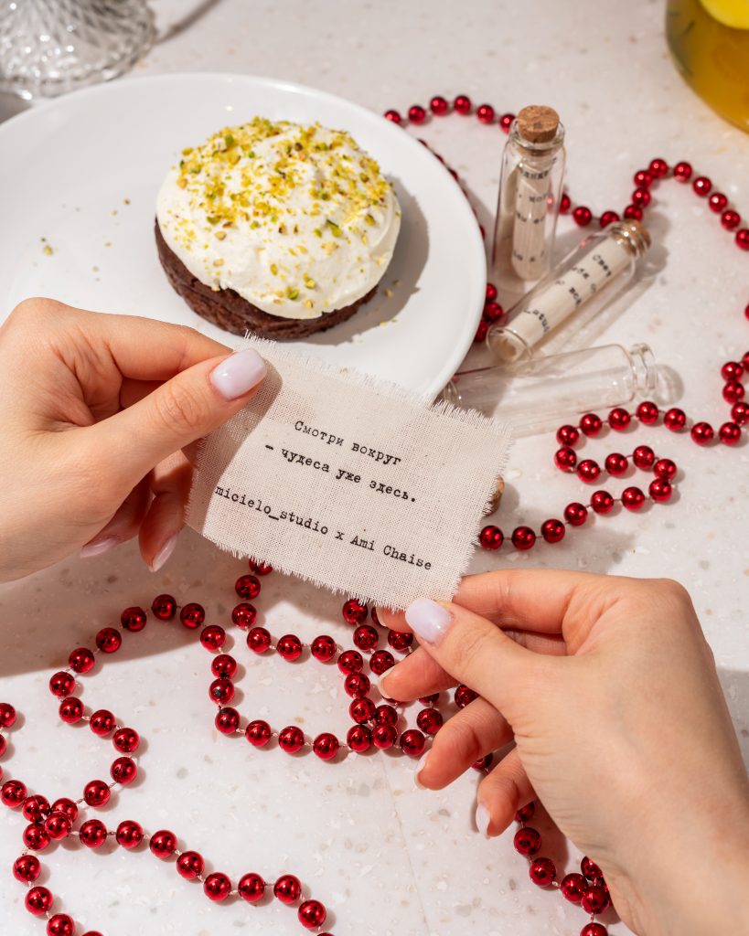 Бренд-шеф AMI CHAISE Наталья Ефимова начала предновогодний сезон с разработки десерта – брауни с лимонным курдом и кремом баноффи. При заказе блюда каждому гостю преподнесут небольшой подарок: колбу от micielo studio с пожеланием на 2026 год и сюрпризом от брендов-партнеров: Иль Де Ботэ, Reshape, Around the World и LITEBODY17.