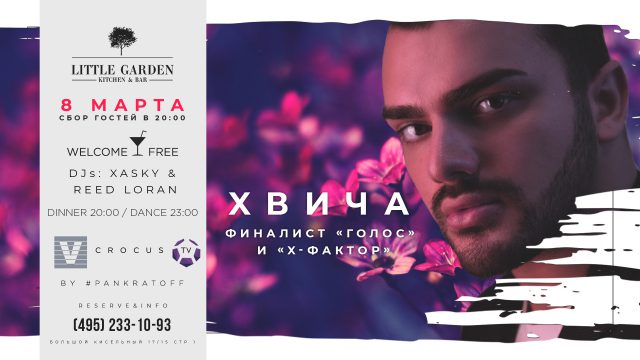 В баре Little Garden 8 Марта выступит финалист шоу «Голос» и грузинского «Х-Фактор» Хвича. Будет радовать обаянием и вокальными данными.