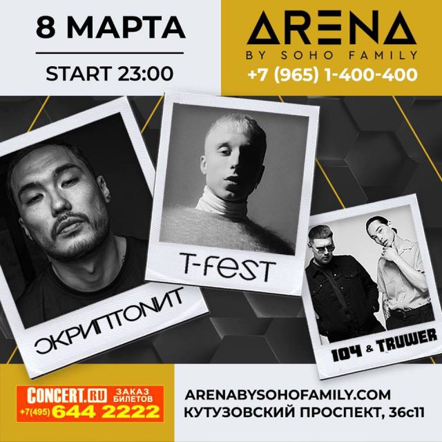 А для тех, кто хочет провести 8 марта с главными рэперами «Газгольдера» (уверены, таких много) в Женский день в клубе Arena выступят T-Fest, Скриптонит и Truwer. Билеты от 3 тыс. р.