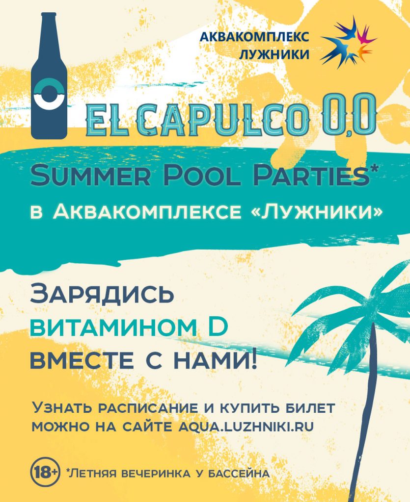 По-настоящему расслабиться, отдохнуть и зарядиться солнцем можно не только в отпуске на море, но и в городе. Предлагаем сделать это 8 июля на открытии сезона El Capulco 0.0 Summer Pool Parties в Аквакомплексе «Лужники». Спонсор жарких пляжных вечеринок, классного настроения и твоего идеального шоколадного загара этим летом — безалкогольный лагер El Capulсo 0,0 с витамином D. Не выезжая из Москвы, гости смогут погрузиться в атмосферу расслабляющего пляжного курорта: искупаться в открытом бассейне, почилить на шезлонге и зажечь под авторские DJ-сеты. Идеальным дополнением станет освежающая новинка – безалкогольный лагер в мексиканском стиле El Capulco 0.0 с витамином D, чтобы солнце было не только снаружи, но и внутри.