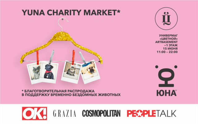 И уже начни заранее готовиться к маркету на следующих выходных! 15 июня с 11:00 до 22:00 в Универмаге «Цветной» Центр «Юна» проведет благотворительную распродажу в пользу бездомных животных Yuna Charity Market. Гостей распродажи будут ждать одежда, аксессуары, косметика, а все собранные средства будут направлены на строительство выгульных площадок для собак, а также лечение и содержание подопечных Центра «Юна». Приходи шопиться, общаться со звездами (Елена Крыгина и другие) и помогать – на территории распродажи будет организован пункт сбора помощи для животных из приютов, куда можно принести корма, лекарства, игрушки и другие гостинцы.