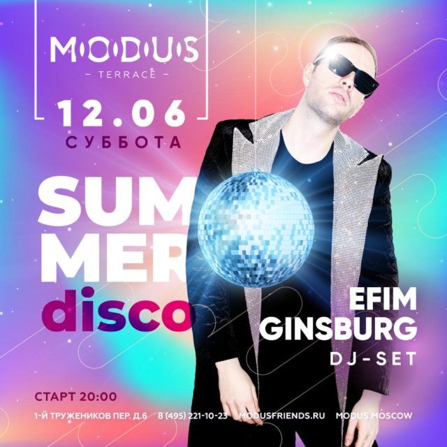 Что может создать настроение лета лучше, чем вечеринки на свежем воздухе – с долгожданными встречами, танцами, модными ритмами? Атмосферу настоящего московского лета можно и нужно ловить на летней веранде ресторана Modus. А с начала июня здесь каждые выходные проводят шумные вечеринки с лучшими диджеями. 12 июня за музыку и хорошее настроение ответит Dj Ginsburg.