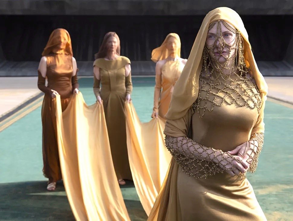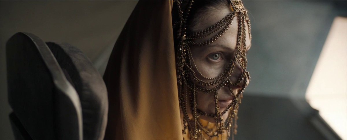 Украшения для платья от Жаклин Уэст несколько месяцев создавали вручную. Каждое звено сетки из бусин плел один из художников по костюмам «Дюны». Вдохновением для создания наряда стали работы Кристобаля Баленсиаги.