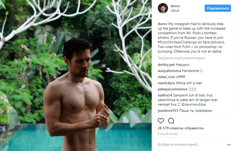 «Моему Instagram нужно серьезно постараться, чтобы не отставать в конкуренции со снимками Путина без рубашки. Если ты россиянин, должен принять участие в #PutinShirtlessChallenge. Два правила от Путина: никакого фотошопа и перекачивания. В противном случае – ты не «альфа»», — написал Дуров в своем Instagram. Напомним, две недели назад Путин отдыхал в Южной Сибири: президент рыбачил, загорал и ходил по горным рекам. Снимки с отдыха Путина тут же облетели все мировые СМИ.