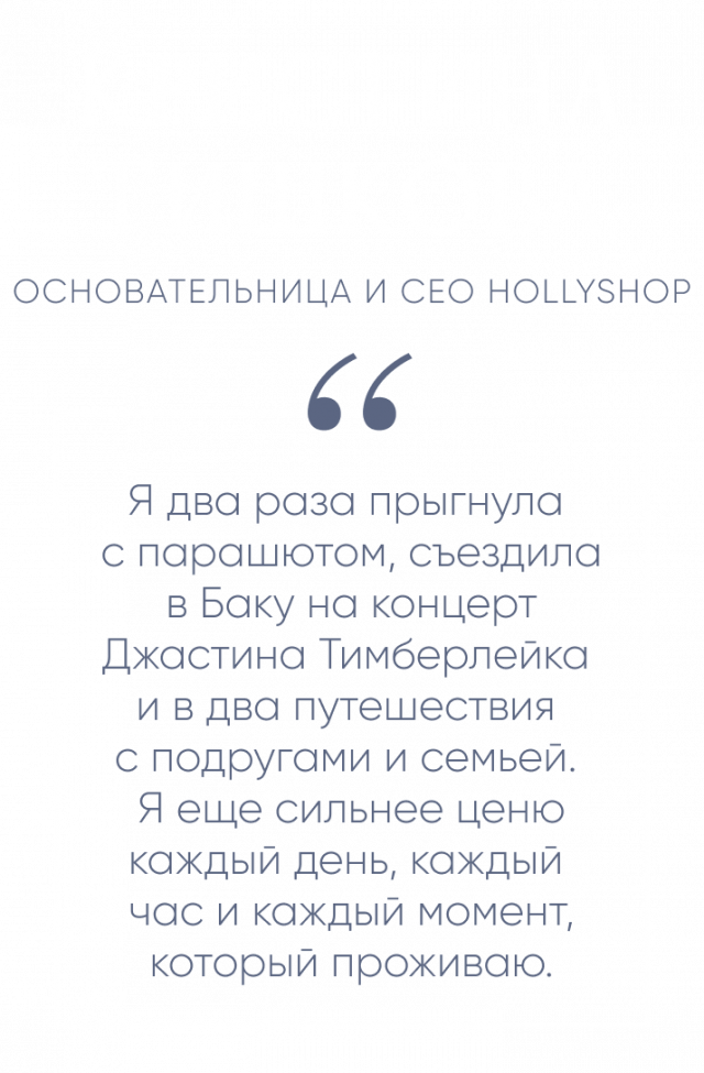 Я два раза прыгнула с парашютом, съездила в Баку на концерт Джастина Тимберлейка и в два путешествия с подругами и семьей. Еще сильнее ценю каждый день, каждый час и каждый момент, который проживаю.