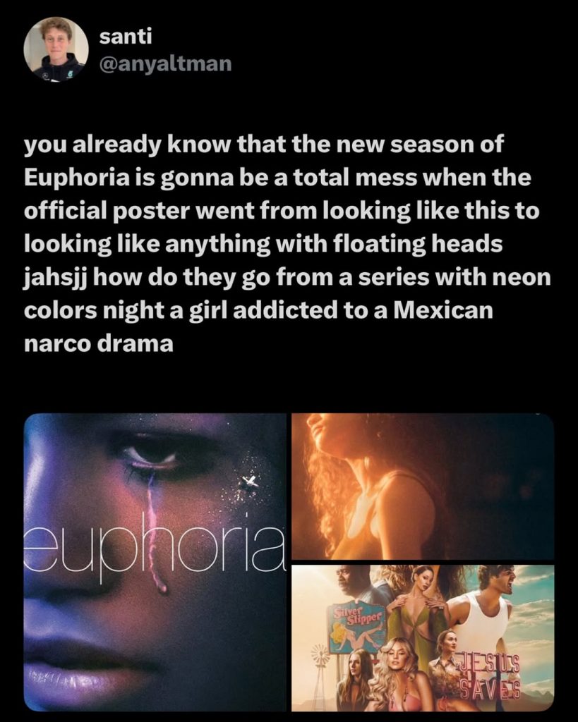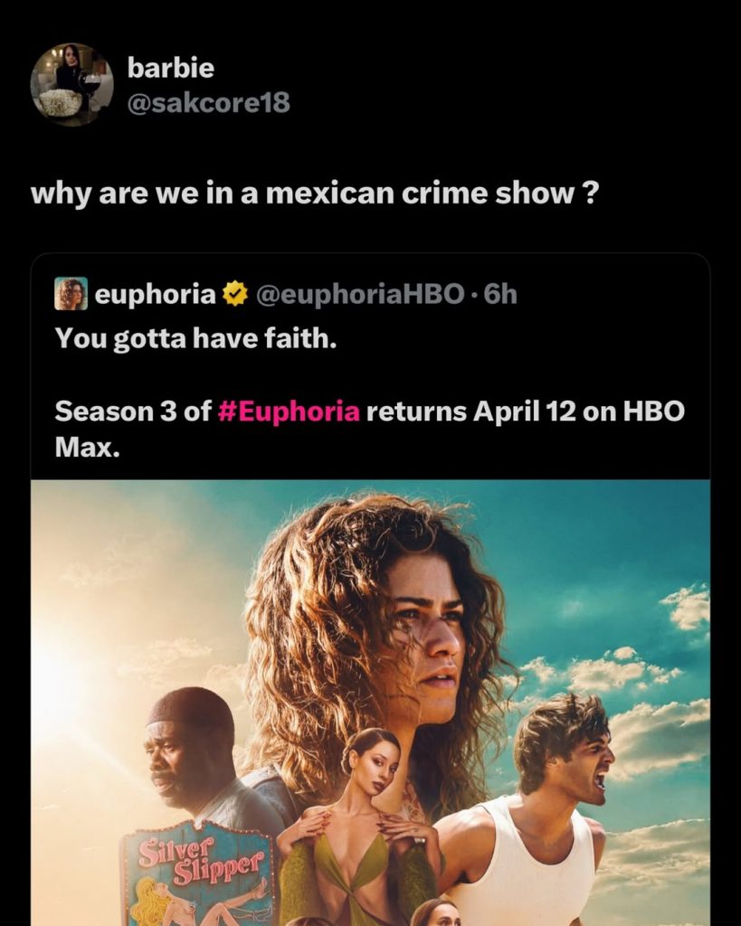 Также многие поклонники говорят о кардинальной смене таинственной, немного мрачной, но с большим количеством глиттера атмосферы сериала, из-за которой изначально всем и полюбилось шоу. Мол, теперь «Эйфория» кажется мексиканским криминальным шоу, нежели подростковой драмой.