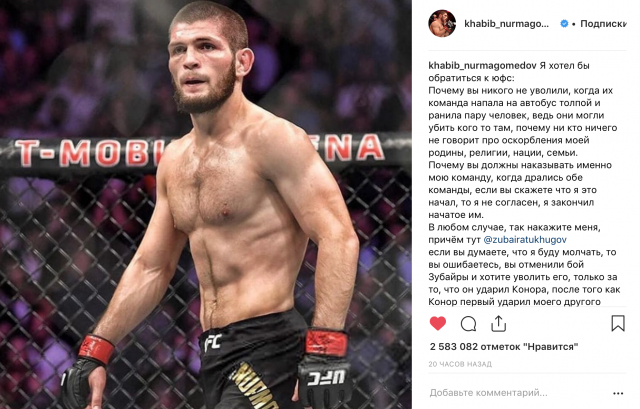 Но Хабиб молчать не стал! Боец опубликовал пост в Instagram, в котором заявил о готовности уйти из UFC и отказаться от гонорара за бой с Конором. Причина: его товарища по команде Забайру Тухугова могут уволить за драку, произошедшую после боя. «Почему вы никого не уволили, когда команда Конора напала на автобус толпой и ранила пару человек, ведь они могли убить кого-то там, почему никто ничего не говорит про оскорбления моей родины, религии, нации, семьи. Почему вы должны наказывать именно мою команду, когда дрались обе. Если вы скажете, что я это начал, то я не согласен – я закончил начатое. В любом случае накажите меня, причем тут Зубайра Тухугов? Вы отменили бой Зубайры и хотите уволить его за то, что он ударил Конора, после того как Конор первый ударил моего другого брата — на камере все видно. Знайте, вы и меня потеряете вместе с ним. У нас в России мы своих не бросаем, и я за своего брата пойду до конца. Если вы все-таки решите его уволить, то и мне не забудьте отправить разорванный контракт, в противном случае я сам его порву. И да, чуть не забыл: гонорар мой, который вы не отдаете и с которым так возитесь, можете оставить себе, только смотрите чтоб он у вас в горле не застрял», – написал Нурмагомедов.