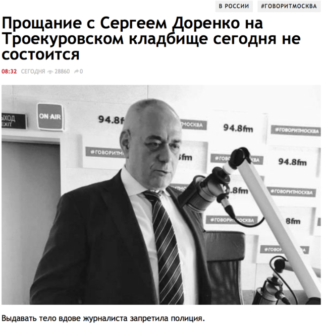 Позже эту новость подтвердили на радиостанции «Говорит Москва»: на сайте СМИ рассказали, что полиция запретила выдавать вдове Доренко его тело для захоронения или кремации «в связи с необходимостью повторной судебно-медицинской экспертизы».