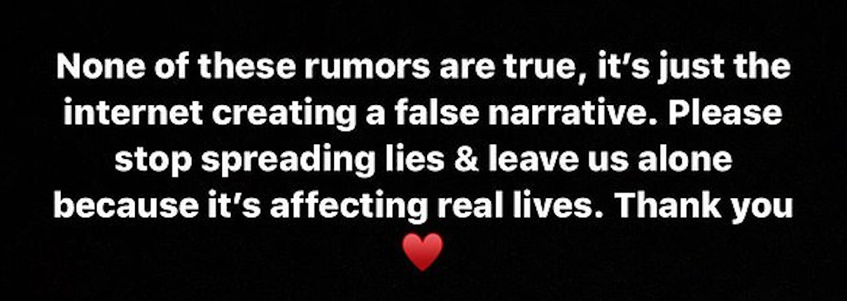 Девушка вчера на странице в Instagram слухи сразу же опровергла: «Все эти слухи — вымысел, просто люди в Интернете выдумывают неправдивую историю. Пожалуйста, перестаньте распространять ложь и оставьте нас в покое, потому что вы затрагиваете нашу личную жизнь. Спасибо».