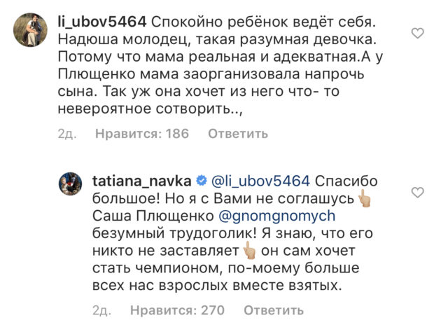 «Спокойно ребенок ведет себя. Надюша молодец, такая разумная девочка. Потому что мама реальная и адекватная. А у Плющенко мама заорганизовала напрочь сына. Так уж она хочет из него что-то невероятное сотворить…», — написал один из пользователей. И Навка решила ответить! «Спасибо большое! Но я с Вами не соглашусь. Саша Плющенко безумный трудоголик! Я знаю, что его никто не заставляет, он сам хочет стать чемпионом, по-моему, больше всех нас взрослых вместе взятых», — заявила она.