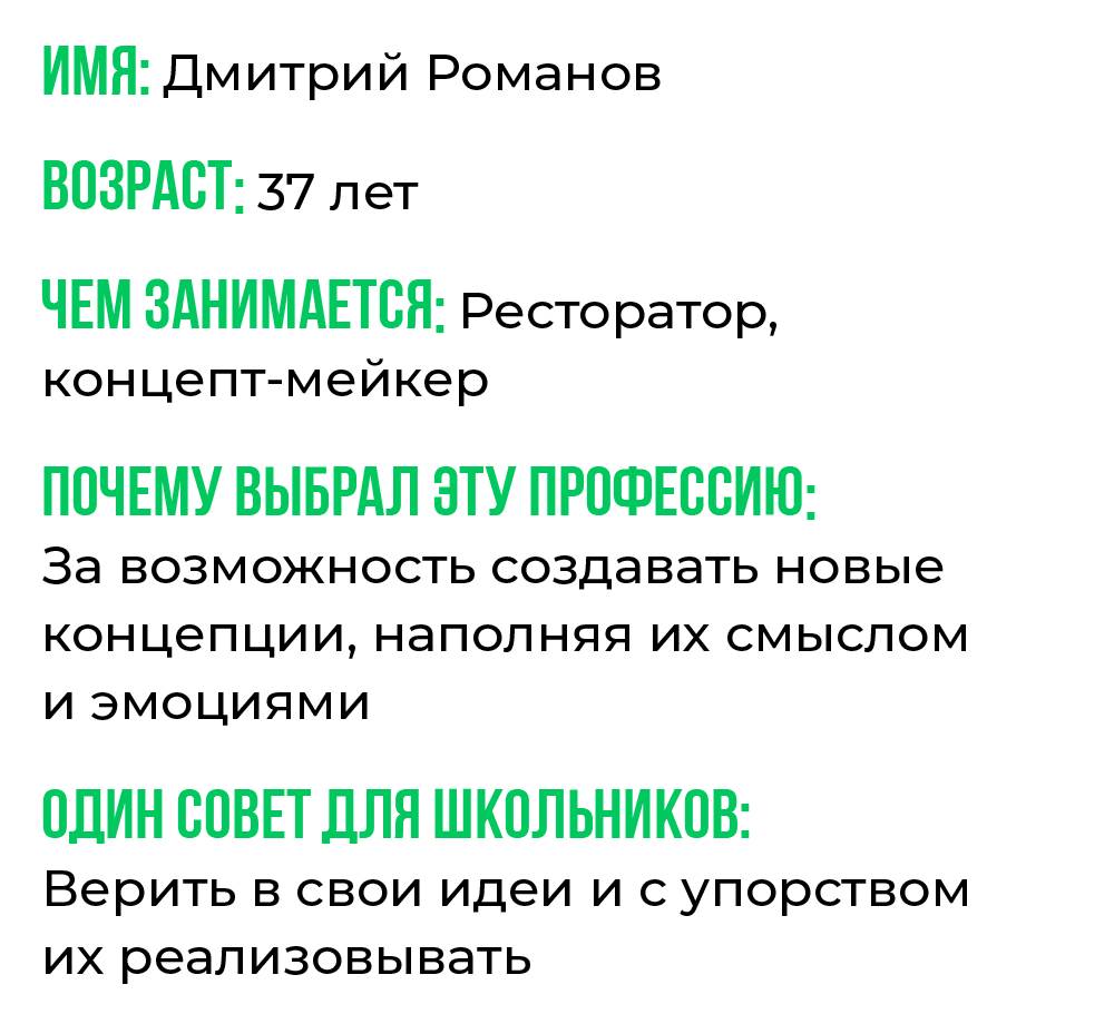 Каждую неделю наши ведущие Роза и Даня будут знакомить тебя с разными профессиями и рассказывать о главных инсайтах каждой области: сколько зарабатывает машинист башенного крана, бывает ли выгорание у океанологов, почему рестораторы не любят модную еду? У каждого из представителей профессии свой особенный путь, но всех их объединяет любовь к своему делу и желание вставать на работу каждый понедельник без будильника.