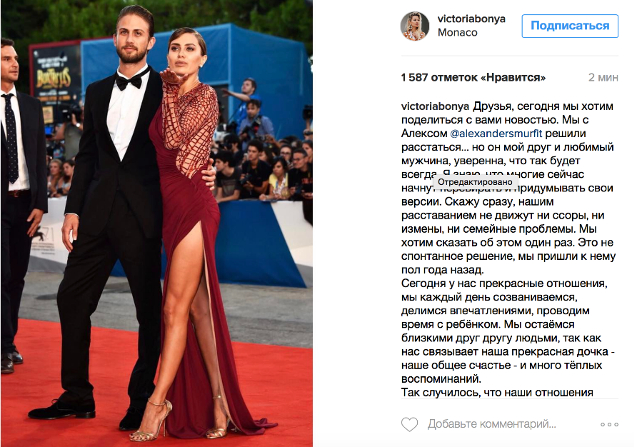 Но в феврале этого года пара распалась, о чем Виктория сообщила у себя в Instagram.