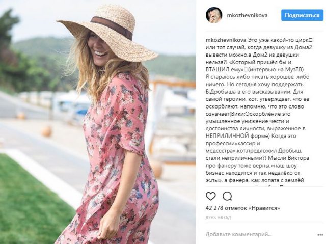 Вчера Мария Кожевникова (32) решила вступить в конфликт Ольги Бузовой (31) и Виктора Дробыша (51) и встала на сторону продюсера. В своем Instagram она написала: «Я стараюсь либо писать хорошее, либо ничего. Но сегодня хочу поддержать Дробыша в его высказывании. Для самой героини, которая утверждает, что ее оскорбляют, напомню, что это слово означает (Оскорбление — это умышленное унижение чести и достоинства личности, выраженное в НЕПРИЛИЧНОЙ форме) Когда это профессии «кассир и медсестра», которые предложил Дробыш, стали неприличными?! Мысли Виктора про фанеру тоже верны, «наш шоу-бизнес находится и так недалёко от ж*ы», а фанера, как лопата, с землёй закапывает его ещё глубже. Правда, здесь не только одна «звезда» виновата, а многие вносят свой «бесценный» вклад , чтобы забить последний гвоздь в нашу музыкальную индустрию. Я не считаю правильным запрещать кому-то в творчестве или тем более за это осуждать, но уважать зрителя любой артист обязан. И это проявляется не в постах инстаграма «ой, как я вас люблю», а в реальности, в живом звуке, в настоящих эмоциях, которые объединяют артиста и зрителя. Не буду давать этому оценку, так как факт остаётся фактом, популярность растёт, и все обсуждения, даже мое, добавит только популярности, пусть и не много, с моими двумя миллионами, так как для меня важнее качество, а не количество! В плане творчества здесь, на вкус и цвет товарища нет, я такую музыку не слушаю» , — высказалась актриса в своем Instagram (Орфография и пунктуация автора сохранены. – Прим. ред.).