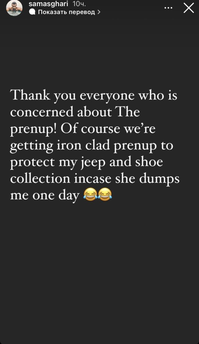 Сэм Асгари, видимо, решил не отмалчиваться во время обвинений и ответил всем, кто переживает за певицу, в своем Instagram. «Спасибо всем, кто обеспокоен нашим брачным соглашением, которое нужно для того, чтобы сохранить джип и коллекцию обуви, когда она меня бросит», — пошутил Сэм.