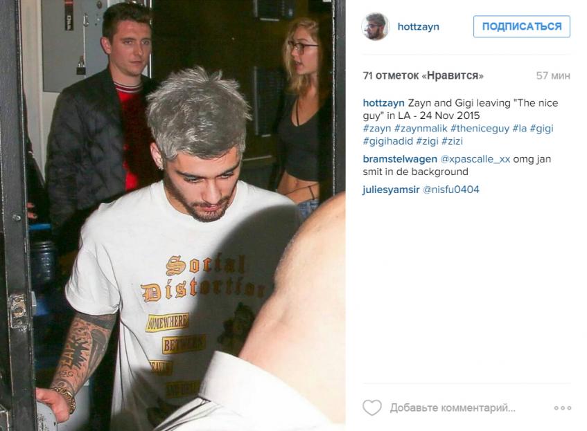 24 ноября Джиджи и Зейн решили поужинать в ресторане The Nice Guy в Голливуде. Как сообщают инсайдеры, модель, которая появилась в рваных синих джинсах, черном топике и без косметики, не могла оторваться от певца, который вышел в белой футболке с рисунком и таких же рваных джинсах.