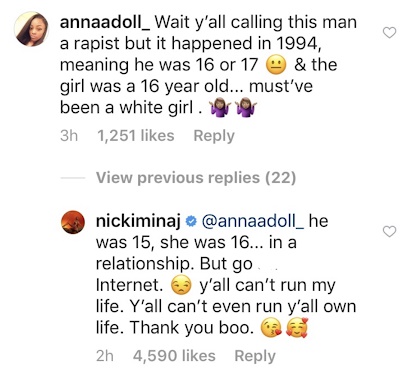 «Ему было 15 лет, ей было 16… Они были в отношениях. Валите из Интернета. Вы не можете управлять моей жизнью. Вы даже не можете управлять своей жизнью», — заявила Минаж в декабре 2018 года.