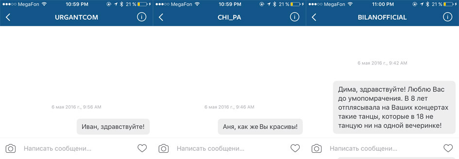 Действовать ненавязчиво я в принципе не умею, поэтому мои сообщения похожи на бред безумной фанатки, которая мечтает о лайке Димы Билана (34) на своем фото в Instagram. Итоги эксперимента таковы: Аня Чиповская не узнала, что я считаю ее очень красивой, Ваня Ургант (38) мое бодрое приветствие проигнорировал, а Билан никогда не вспомнит ту восьмилетнюю девочку, прыгавшую на трибунах его концерта в далеком 2006 году.