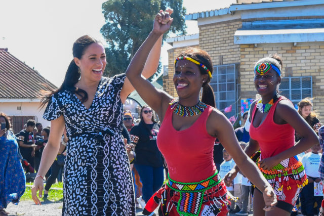 «Эту фотографию сделали в сентябре, во время королевского тура в Южную Африку. Это очень необычный кадр, потому что здесь Меган танцует с местными жителями».