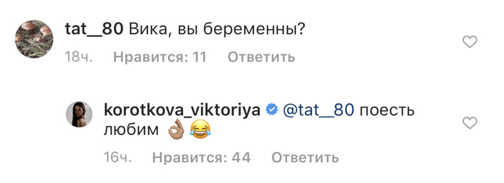 И сейчас в Instagram начали говорить, что Вика беременна: мол, реже выкладывает фото, где виден живот. Но она в комментариях на вопрос о положении ответила: «Поесть любим».