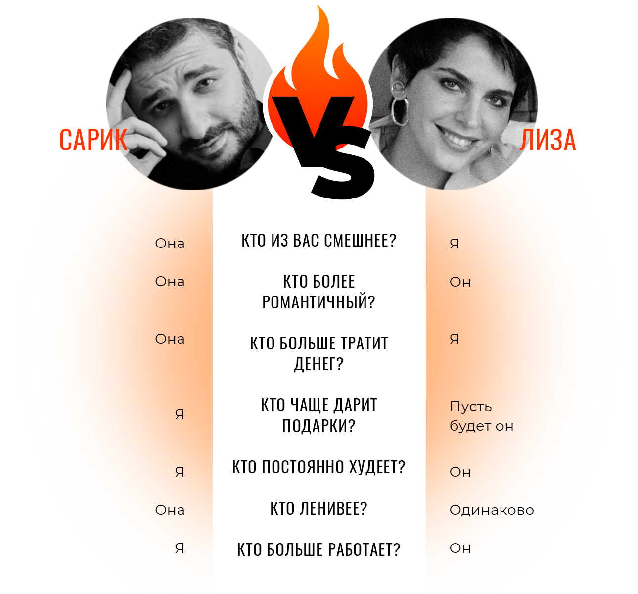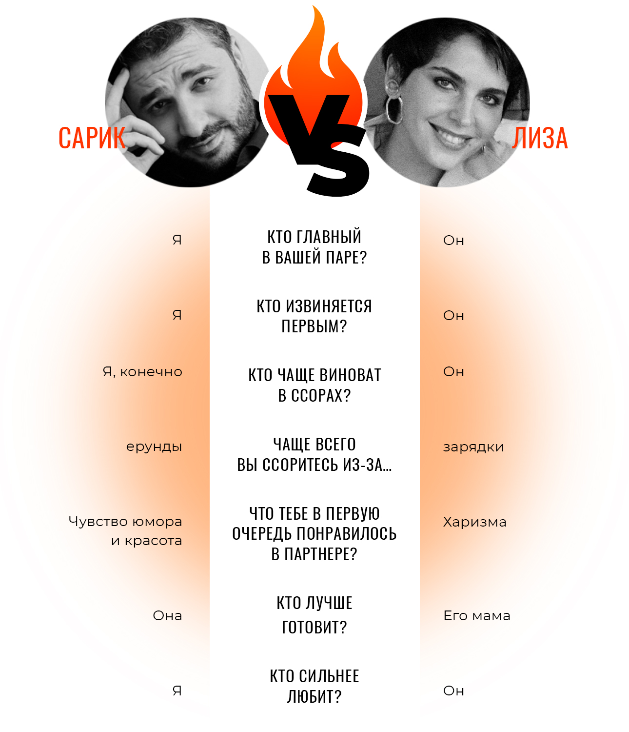 Сарик: Нервы у меня теперь ни к черту. (Смеется.) Я никому этого не рассказывал, но у меня был очень строгий отец, я воспитывался в абсолютно ортодоксальной армянской семье и, например, практически ни разу в жизни не видел, чтобы папа купил маме цветы. Не потому, что он плохой или не любит ее, а потому, что не принято. С появлением Лизы в моей жизни я научился не стесняться своих чувств, говорить о них.