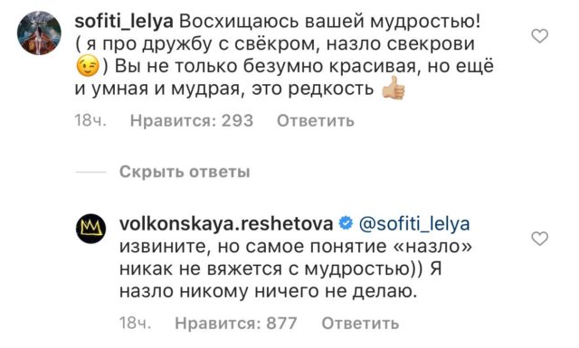 На что Решетова сразу же обратила внимание и ответила: «извините, но само понятие «назло» никак не вяжется с мудростью)) Я назло никому ничего не делаю».