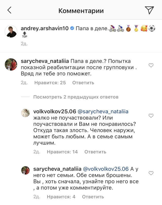 Она написала: «Папа в деле? Попытка показной реабилитации после групповухи. Вряд ли тебе это поможет. У него нет семьи! Обе семьи брошены! Вы хоть сначала узнайте про него все, а потом уже комментируйте».
