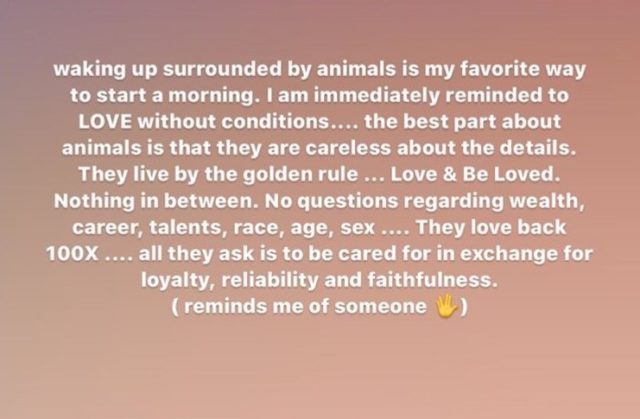 Сегодня утром Майли Сайрус (26) опубликовала в Instagram откровенное сообщение, в котором призналась в любви… животным! «Просыпаться в окружении животных — мой любимый способ начать утро. Я сразу же напоминаю себе о том, что нужно любить безусловно… Самое лучшее в животных ― это то, что они не беспокоятся о частностях, что они живут по «золотому правилу»: любите и будьте любимы. Все, о чем они просят, ― это чтобы о них заботились. Взамен они дают преданность, надежность и верность», — поделилась она.