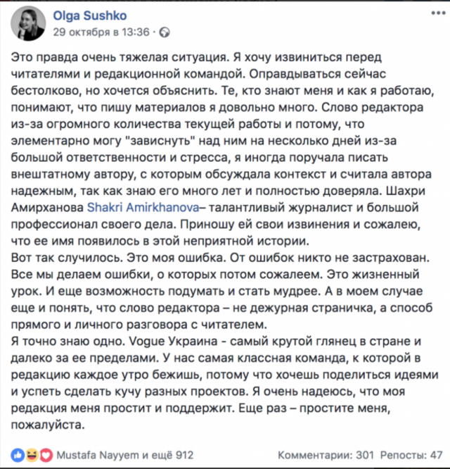 Сама Ольга не растерялась и написала большой пост с извинениями: «Это правда очень тяжелая ситуация. Я хочу извиниться перед читателями и редакционной командой. Оправдываться сейчас бестолково, но хочется объяснить. Те, кто знают меня и как я работаю, понимают, что пишу материалов я довольно много. Слово редактора из-за огромного количества текущей работы и потому, что элементарно могу «зависнуть» над ним на несколько дней из-за большой ответственности и стресса, я иногда поручала писать внештатному автору, с которым обсуждала контекст и считала автора надежным, так как знаю его много лет и полностью доверяла. Шахри Амирханова – талантливый журналист и большой профессионал своего дела. Приношу ей свои извинения и сожалею, что ее имя появилось в этой неприятной истории. Вот так случилось. Это моя ошибка. От ошибок никто не застрахован. Все мы делаем ошибки, о которых потом сожалеем. Это жизненный урок. И еще возможность подумать и стать мудрее. А в моем случае еще и понять, что слово редактора – не дежурная страничка, а способ прямого и личного разговора с читателем. Я точно знаю одно. Vogue Украина — самый крутой глянец в стране и далеко за ее пределами. У нас самая классная команда, к которой в редакцию каждое утро бежишь, потому что хочешь поделиться идеями и успеть сделать кучу разных проектов. Я очень надеюсь, что моя редакция меня простит и поддержит. Еще раз – простите меня, пожалуйста».