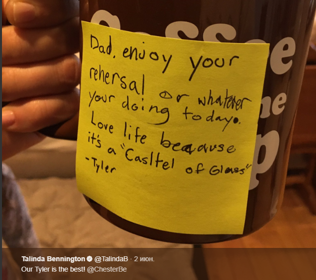 За несколько недель до трагедии жена Честера, модель Талинда Бентли, опубликовала в Twitter трогательное фото: 11-летний сын Честера Тайлер оставил записку на утренней чашке кофе Беннингтона. Мальчик написал: «Папа, наслаждайся своими репетициями, или что там у тебя на сегодня запланировано. Люби жизнь, потому что это «Замок из стекла»». Именно так называется песня с альбома Living Things, который вышел в 2012 году. В ней есть и такие строки: «Отведи меня к изгибу реки, отведи меня туда, где конец борьбе, смой с моей кожи яд, научи меня, как снова стать целым».