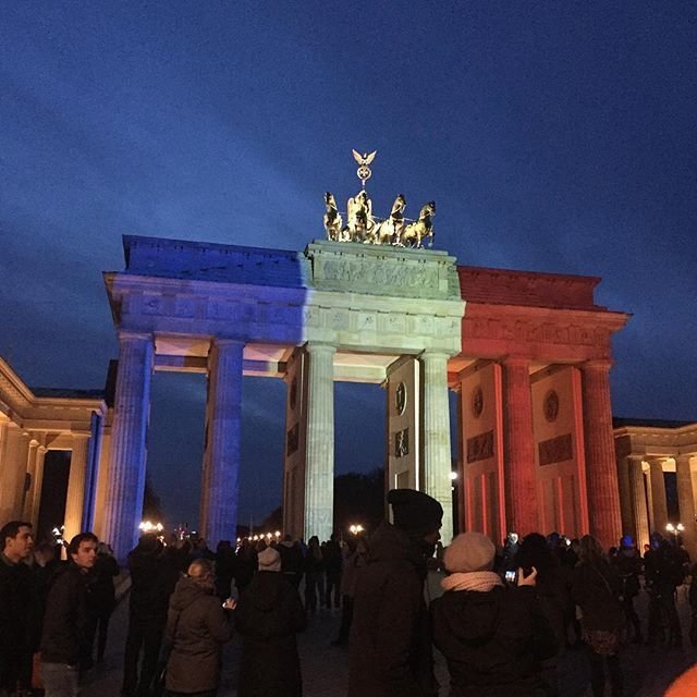 В Германии Бранденбургские ворота также загорелись цветами национального французского флага.