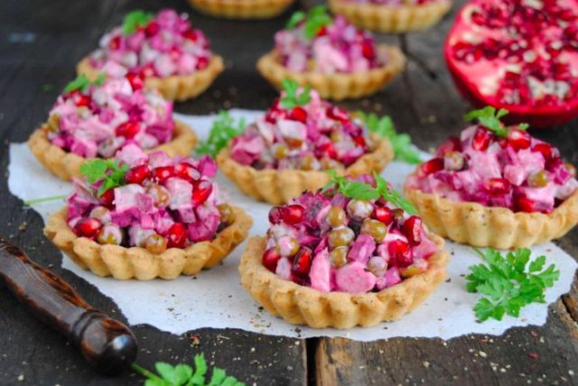 В десятку также вошли салат «Мимоза», холодец, крабовый салат, салат с кальмарами, тарталетки всех видов, салат с курицей и ананасами и салат «Гранатовый браслет».