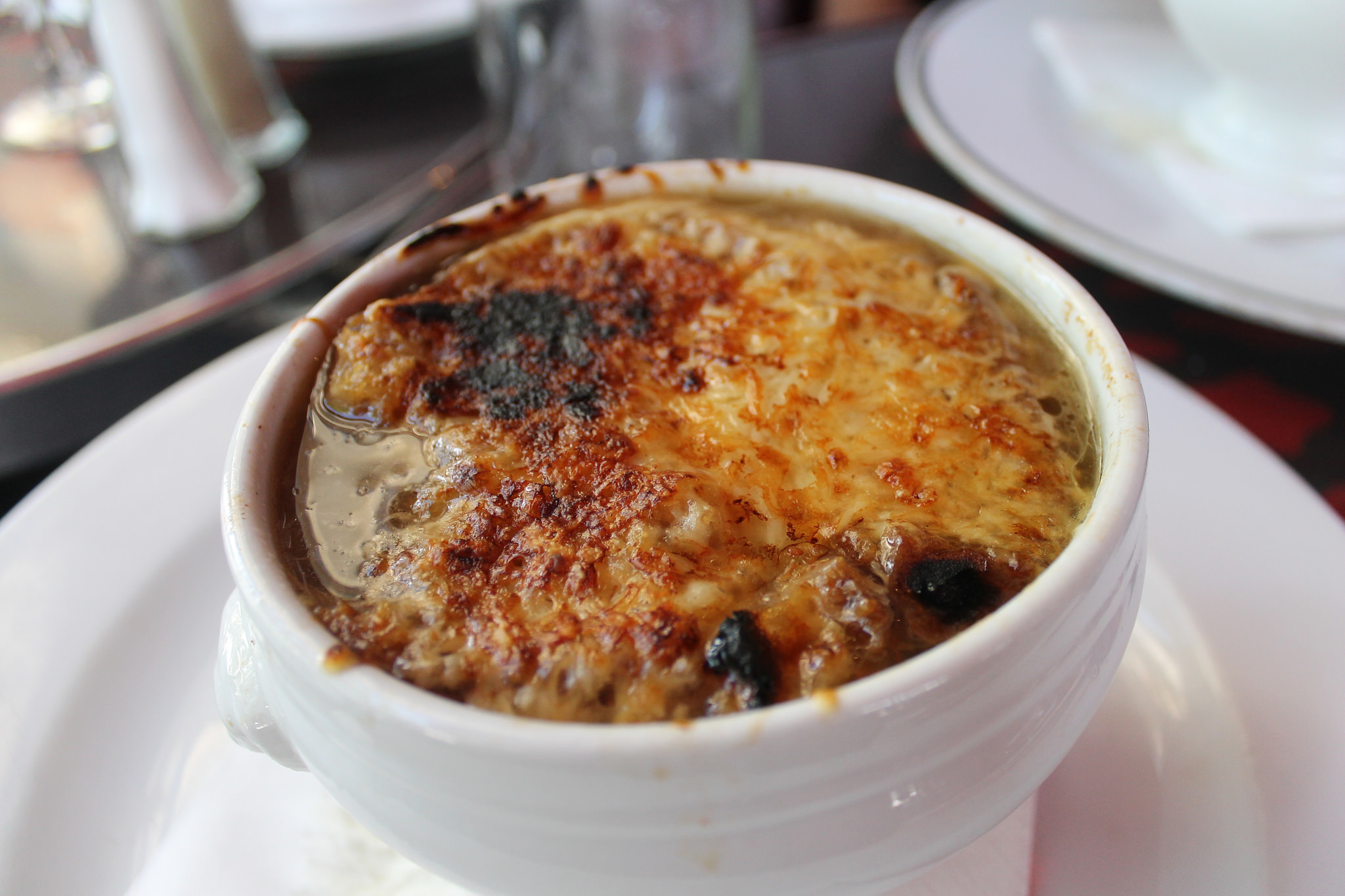 Растопи масло в кастрюле с толстым дном и на среднем огне поджарь лук, часто помешивая. Лук должен обрести золотистый цвет и размягчиться. Посоли и поперчи, посыпь лук сахаром, мукой и помешивай еще 10 минут. Затем влей горячий бульон, доведи его до кипения и вари на медленном огне 30–40 минут. Разлей суп по горшочкам, положи сверху ломтики хлеба, слегка утопив их так, чтобы они намокли с обеих сторон. Посыпь тертым сыром и запекай в духовке до образования румяной сырной корочки. Можешь подавать!