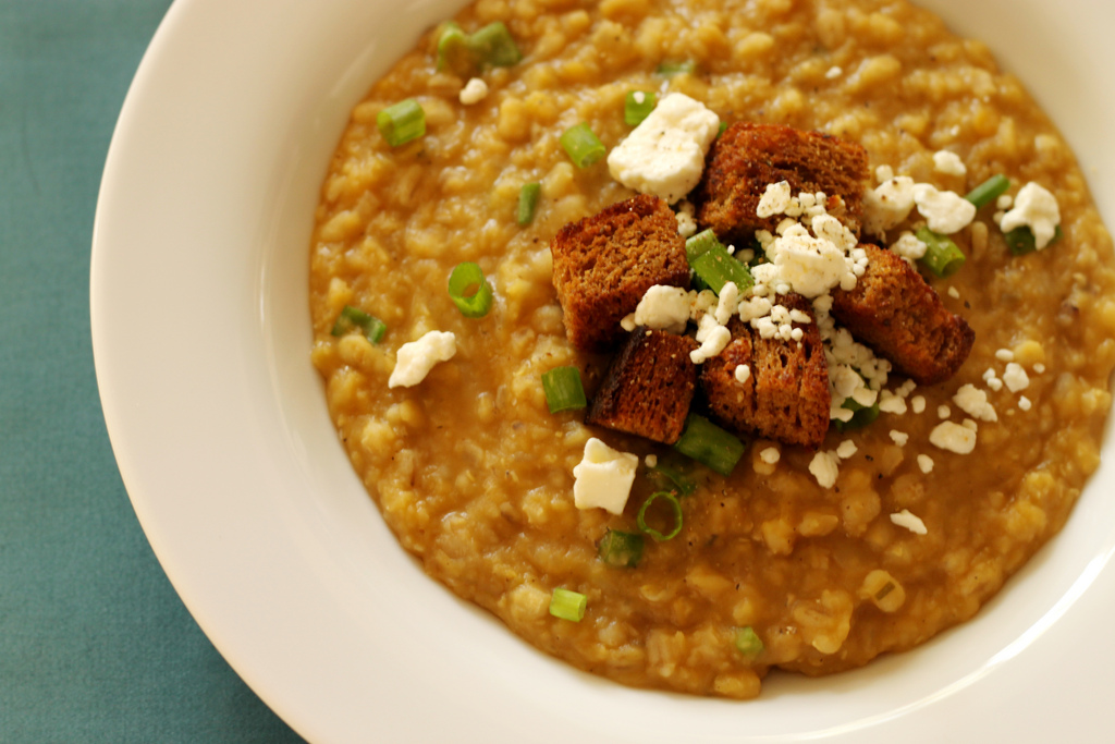 Положи стакан чечевицы в воду или бульон, поставь на огонь. Спустя 10 минут после закипания добавь также пшеничную крупу. После этого вари суп на медленном огне в течение 30 – 40 минут, пока крупа не разварится.