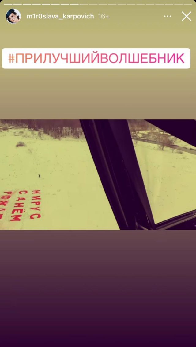 Накануне звезде «Папиных дочек» исполнилось 35 лет и в честь дня рождения Павел Прилучный подготовил ей необычный подарок — полет на вертолете, после взлёта на котором открылась надпись в поле: «Мирус, с днем рождения». И рядом с текстом — огромное сердце. Об этом стало известно из видео, опубликованного в Instagram Мирославы.