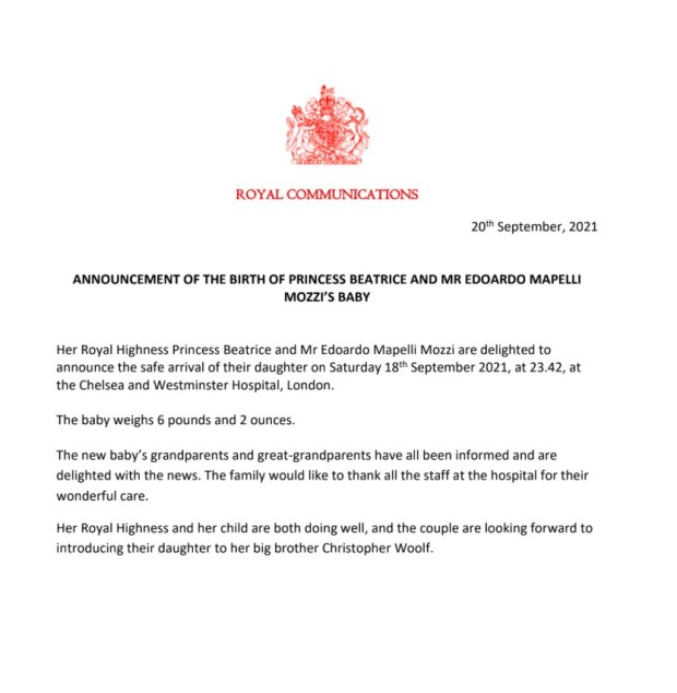 Букингемский дворец подтвердил радостную новость, опубликовав официальное заявление. «Ее Королевское Высочество принцесса Беатрис и г-н Эдоардо Мапелли-Моцци рады объявить о рождении своей дочери в субботу 18 сентября 2021 года в 23:42». Малышка родилась весом 6,2 фунта. В заявлении также сказано, что вся семья уже проинформирована о появлении на свет наследницы. Они благодарят весь персонал больницы за заботу и профессионализм.