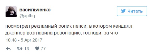 Представители компании уже удалили ролик и извинились перед возмущенными Интернет-пользователями: «Компания Pepsi пыталась создать глобальное сообщение о единстве, мире и взаимопонимании. Ясно, что был упущен из виду важный момент. Мы не собирались освещать какую-либо серьезную проблему. Приносим извинения, что привлекли Кендалл Дженнер». Бедная Кендалл (не ее ведь сценарий) попала под перекрестный огонь. Ситуацию она не комментирует, но вот лицо от папарацци после этого скандала прятала.