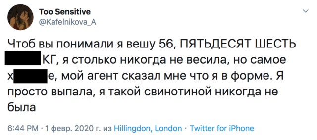 Алеся Каф (21) в Twitter только недавно писала: «Чтобы вы понимали, я вешу 56 кг, я столько никогда не весила, но самое хе#@%!вое, мой агент сказал мне, что я в форме. Я просто выпала, я такой свинотиной никогда не была».